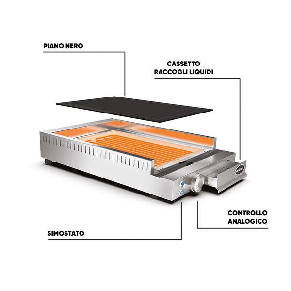 - Doppia zona di cottura indipendente – Due piani da 280 x 440 mm, per una gestione flessibile e simultanea di diverse preparazioni.